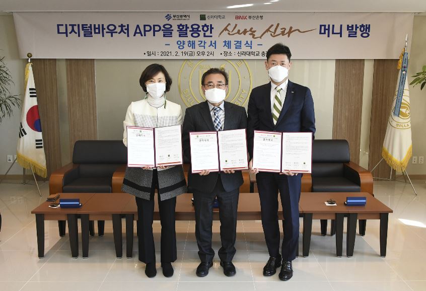 [부산=일요신문] BNK부산은행은 지난 19일 오후 신라대학교 대학본부에서 신라대학교, 부산광역시와 디지털바우처 앱(APP)을 활용한 ‘신나는 신라머니’ 발행 업무협약을 체결했다.