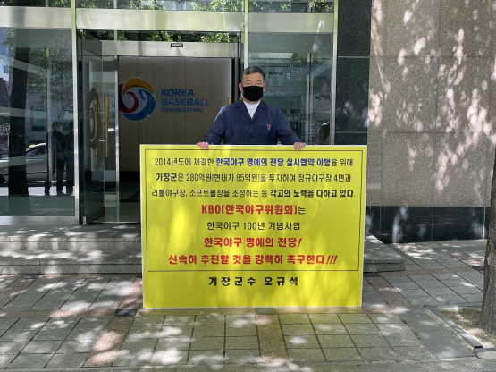 이는 작년 10월 7일에 이어 두 번째로 진행한 1인 시위로 그간 KBO(한국야구위원회) 운영진 교체와 운영비 부담 등의 문제로 지연됐던 ‘한국야구 명예의 전당’ 사업의 정상화와 ‘KBO-부산시-기장군 실시협약’의 이행을 강력히 촉구하기 위해 이뤄졌다.