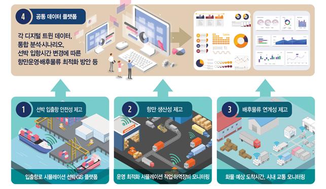 한국판 뉴딜 정책의 10대 대표과제에도 선정된 디지털 트윈 기술을 활용해 실제 부산항과 동일한 가상현실을 구현하고, 선박 입출항 경로 ·시간·접안선석 변경 등 항만운영상 발생하는 여러 상황에 맞춰 터미널 운영사, 운송사 등 다양한 이해 관계자들이 최적화된 의사결정을 할 수 있게 지원하는 통합 플랫폼을 구축할 계획이다.