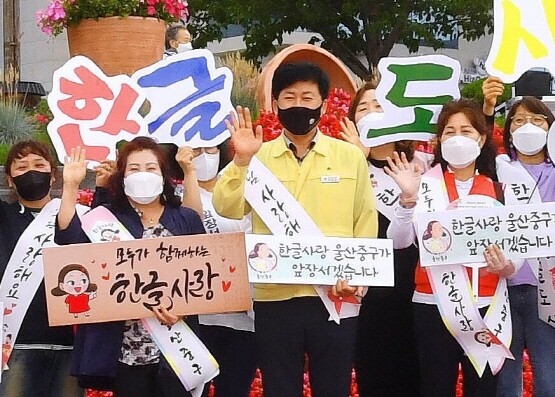 이에 따라 참여자들은 현수막과 손팻말을 들고 한글사랑 실천방법이 적힌 홍보물품을 나눠주면서 ‘한글도시 울산 중구’에 대해 알렸다.