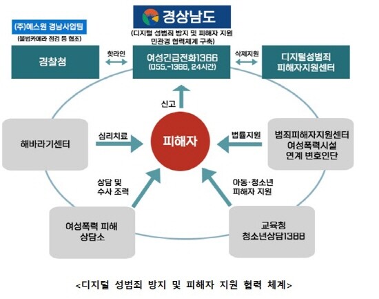 지난해 구축된 민·관·경 협력체계를 통해 1366경남센터에서는 디지털성범죄 신고·상담 및 피해자 지원 거점 역할을 수행하고 있으며, 경남경찰청에서는 특별단속과 디지털성범죄 예방 및 홍보활동 등을 추진하고 있다.