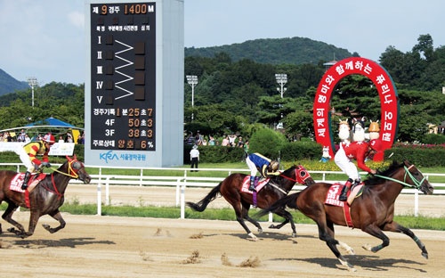 지난 1일 서울경마공원에서 열린 한일 경주마 교류전에서 일본의 토센아처(3번)가 한국의 와츠빌리지(7번)을 제치고 1등으로 결승선에 들어오고 있다. 연합뉴스