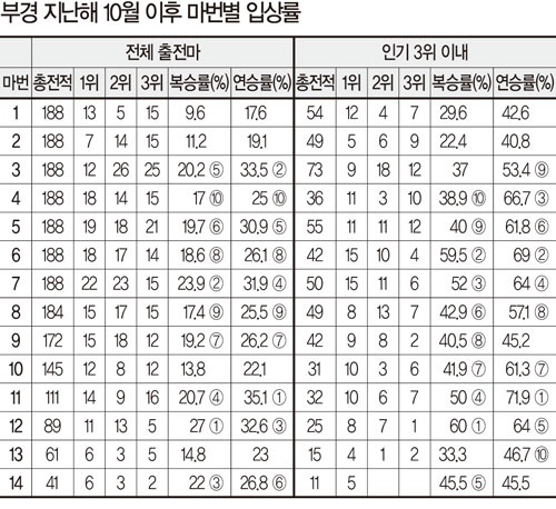 인기 3위 이내의 마필만 분석했을 경우에도 상황은 달라지지 않았다. 최하위는 복승률 22.4%의 2번(연승률 40.8%)이었고 그 다음이 복승률 29.6%를 기록한 1번(연승률 42.6%)이었다. 반면 최외곽인 14번 게이트에서는 복승률 45.5%를 보였다. 14번에 포진하면 전문가들조차 어지간한 인기마는 꺾고 보는데 데이터상으로는 오히려 안쪽 게이트보다 더 믿을 수 있는 셈이다. 인기마 복승률이 가장 높았던 마번도 60%의 가공할 성공률을 보인 12번이었다. 그 외 자세한 내용은 표를 참고하기 바람.