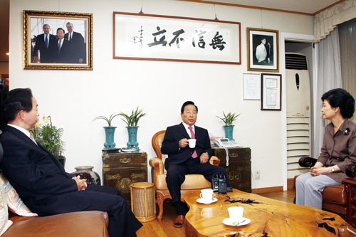 지난 대선 때 박근혜 후보가 서울 상도동 YS 자택에서 김영삼 전 대통령을 예방하는 모습이다. 왼쪽이 김현철 교수.