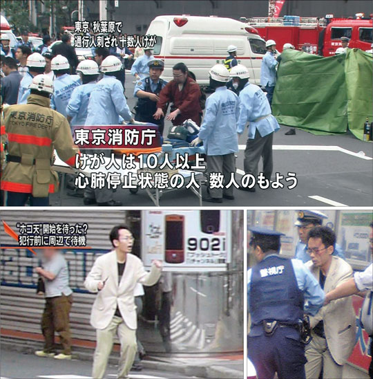 비극의 시작은 2008년 6월 8일 일요일로 거슬러 올라간다. 당시 25세의 비정규직 노동자였던 가토 도모히로는 도쿄 아키하바라에 트럭을 끌고 돌진, 3명을 숨지게 하고 2명에게 부상을 입혔다. 이어 차에서 내린 그는 흉기로 주변 행인들을 닥치는 대로 찔렀고, 그중 4명이 사망했다. 이 사건은 사망자 7명 및 부상자 10명이 발생한 대참사로 기록됐다.