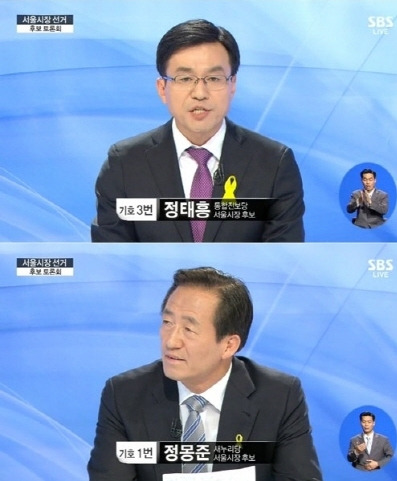 두 후보의 설전은 이후에도 계속됐다. 정태흥 후보는 “정몽준 후보가 색깔론을 말하니, 새누리당의 국가관에 대해 질문하고 싶다”며 “새누리당이 친일, 독재를 미화하는 교과서를 채택하라고 압력을 넣고 있는데 헌법 전면에 반하는 이 같은 행위에 대해 어떻게 생각하나?”라고 공격했다.