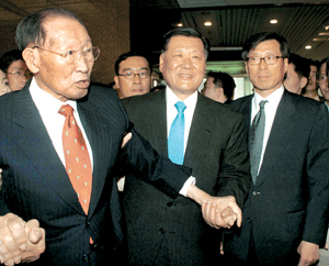 | ▲ 지난 2000년 5월31일 왕자의 난 당시 정주영 명예회장이 3부자 동반퇴진을 선언한 후 정몽구 정몽헌 회장과 함께 현대 사옥을 나서고 있다. 그러나 정 명예회장의 작고 이후 현대그룹은 조각나고 정몽헌 회장은 자살하기에 이른다. | ||