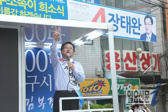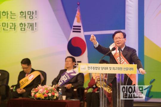 지난 6월 대구시장 선거 막판 유세전(위)과 2012년 1월 민주통합당 전당대회에서 후보연설을 하고 있는 모습. 박은숙 기자