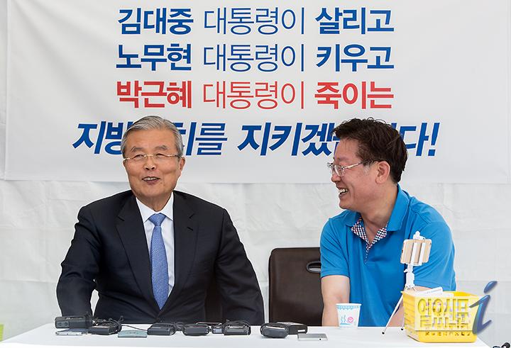 [일요신문] 지방재정개편안 반대 무기한 단식농성중인 이재명 성남시장을 찾은 김종인 더불어민주당 비대위 대표가 8일 오후 서울 광화문광장에서 시민과 이야기를 나누고 있다. 이재명 성남시장은 이틀째 단식 농성을 이어가고 있다. 고성준 기자