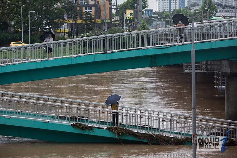 [일요신문] 장마전선의 영향을 받고있는 5일 오후 서울 월릉교에서 시민들이 불어난 중랑천을 지켜보고 있다. 2016.7.5 고성준 기자