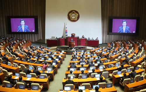 [일요신문] 황교안 국무총리가 27일 오후 국회 본회의에서 정부의 추가경정예산안에 대한 정부의 시정연설을 하고 있다.