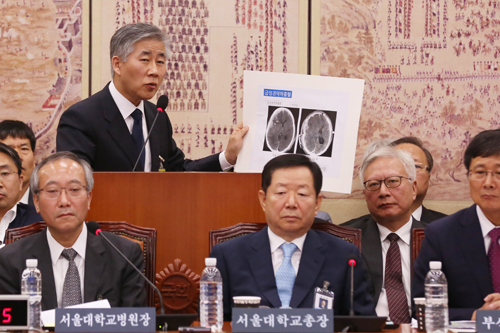 [일요신문] 서창석 서울대학교병원장이 11일 오전 여의도 국회에서 열린 교육문화체육관광위원회 국정감사에 출석해 의원 질의에 답하고 있다.