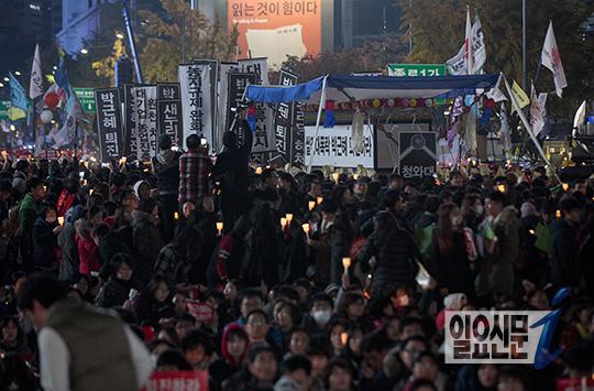 [일요신문] 12일 오후 서울 세종대로 일대에서 박근혜 대통령 퇴진을 요구하는 민중총궐기 시위에 참석한 시민들이 구호를 외치고 있다. 경찰은 이날 집회에 16만~17만 명이 모일 것으로 내다본 반면 주최 측은 100만 명으로 예상하고 있다. 2016.11.12 고성준 기자