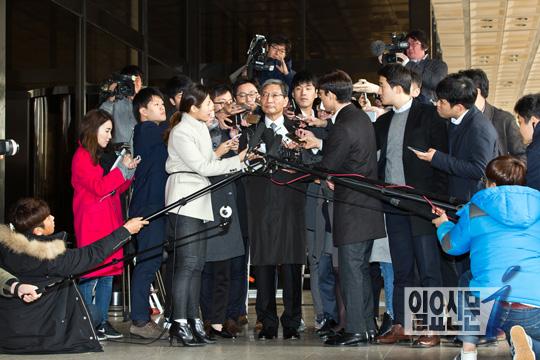 [일요신문] 장충기 삼성그룹 미래전략실 사장이 18일 오전 서울 서초구 서울중앙지방검찰청에 참고인 신분으로 조사를 받기위해 출석하던 중 취재진에게 둘러싸여 있다. / 최준필 기자 choijp85@ilyo.co.kr