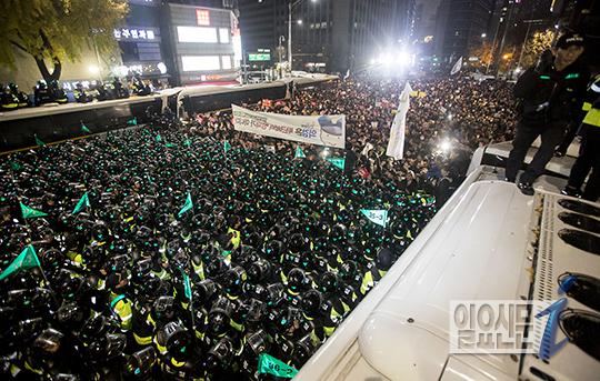 [일요신문] 19일 오후 박근혜 대통령의 퇴진을 요구하는 4차 촛불집회에 참석한 시민들이 서울 종로구 내자동로터리에서 경찰과 대치하고 있다. 이날 촛불집회는 서울뿐 아니라 부산·대구·광주·울산 등 전국 56개 지역에서 동시다발적으로 열린다. 2016.11.19 고성준 기자