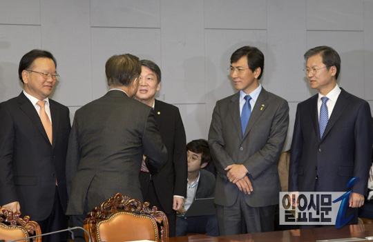[일요신문] 20일 오후 서울 여의도 국회에서 야권의 잠재적 대권후보들인 김부겸 의원, 문재인 의원, 박원순 서울시장, 심상정 정의당 대표, 안철수 의원, 안희정 충남도지사, 이재명 성남시장, 천정배 의원등이 촛불정국과 대통령퇴진 혹은 하야등 국민의 여론을 수렴할 정치적 모임인 비상시국정치회의를 열고 향후 방향에 대해 논의한다. 참석한 문재인 전 민주당 대표가 안철수 전 국민의당 대표에게 인사하고 있다.
