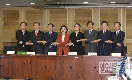 [일요신문] 20일 오후 서울 여의도 국회에서 야권의 잠재적 대권후보들인 김부겸 의원, 문재인 의원, 박원순 서울시장, 심상정 정의당 대표, 안철수 의원, 안희정 충남도지사, 이재명 성남시장, 천정배 의원등이 촛불정국과 대통령퇴진 혹은 하야등 국민의 여론을 수렴할 정치적 모임인 비상시국정치회의를 열고 향후 방향에 대해 논의한다. 참석자들이 손을 엇갈려 잡고 단합된 모습을 보이고 있다.