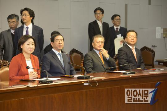 [일요신문] 20일 오후 서울 여의도 국회에서 야권의 잠재적 대권후보들인 김부겸 의원, 문재인 의원, 박원순 서울시장, 심상정 정의당 대표, 안철수 의원, 안희정 충남도지사, 이재명 성남시장, 천정배 의원등이 촛불정국과 대통령퇴진 혹은 하야등 국민의 여론을 수렴할 정치적 모임인 비상시국정치회의를 열고 향후 방향에 대해 논의한다. 참석한 심상정 정의당 대표, 박원순 서울시장, 문재인 전 민주당 대표, 김부겸 의원이 심각한 표정으로 앉아 있다.