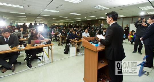 취재진에게 둘러싸인 이규철 대변인