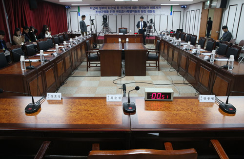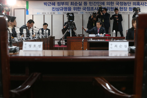 26일 오후 서울 구로구 남부구치소에서 열린 '박근혜 정부의 최순실 등 민간인에 의한 국정농단 의혹사건 진상규명을 위한 국정조사특별위원회 현장 청문회'가 안종범, 정호성 증인이 불출석한 채 열리고 있다. 사진 = 사진공동취재단