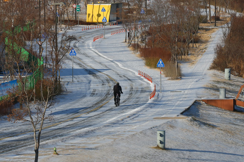 [일요신문] 29일 오전 서울 여의도 한강공원에 한 시민이 자전거를 타고 눈 위를 지나가고 있다.