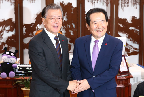 [일요신문] 새해 인사를 나누기 위해 문재인 전 더불어민주당 대표가 2일 오전 여의도 국회 의장실을 찾아 정세균 의장과 악수를 나누고 있다.