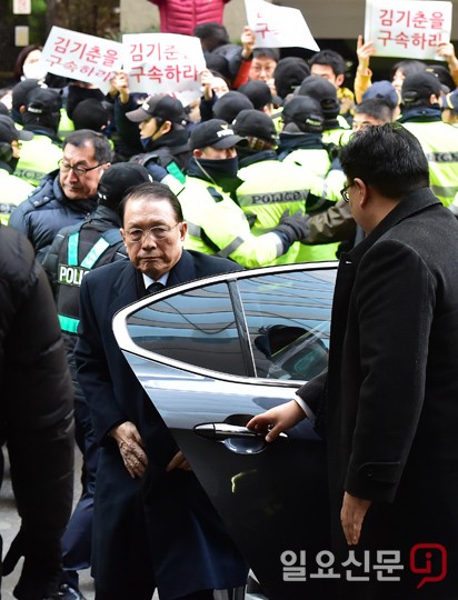 [일요신문] '문화, 예술계 블랙리스트'의 윗선으로 꼽히는 김기춘 전 청와대 비서실장이 17일 오전 직권남용 권리행사방해 혐의의 피의자 신분으로 조사를 받기 위해 서울 강남구 대치동 특검에 출석하고 있다. / 최준필 기자 choijp85@ilyo.co.kr