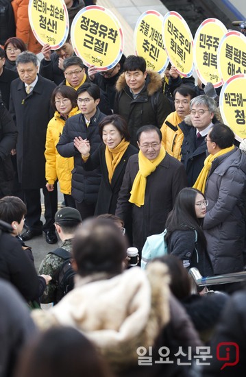 더불어민주당 추미애 대표 등 당직자들이 설 연휴를 앞둔 26일 오전 서울역에서 귀성객들에게 인사하고 있다. 2017.1.26 사진/임준선기자