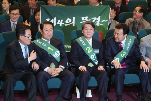 [일요신문] 17일 오전 서울 여의도 국회도서관 대강당에서 열린 국민의당 19대 대선 후보 예비경선에서 개표를 기다리며 후보들이 이야기를 나누고 있다. 왼쪽부터 박지원 대표, 박주선 국회부의장, 안철수 전 대표, 손학규 전 민주당 대표.