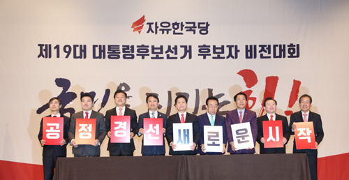 [일요신문] 17일 오후 서울 여의도 63빌딩에서 열린 자유한국당 제19대 대통령후보선거 후보자 비전대회에서 9명의 후보들이 공정경선을 약속하는 피켓을 들고 포즈를 취하고 있다. 왼쪽부터 조경태, 원유철, 신용한, 김진태, 김진, 김관용, 안상수, 이인제, 홍준표.
