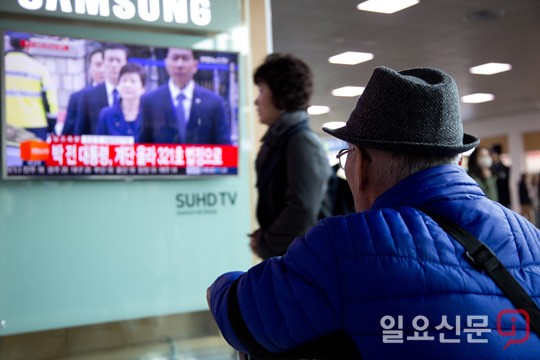 [일요신문] 30일 오전 용산구 서울역에서 시민들이 박근혜 전 대통령이 영장실질심사를 받기위해 법원으로 향하는 뉴스를 바라보고 있다. 2017.03.30.