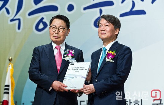 [일요신문] 안철수 국민의당 대선후보가 14일 오후 서울 여의도 63빌딩에서 열린 제19대 대통령 후보 초청 직능-시민사회단체 전국대표자 대회에서 발언을 마치고 오호석 직능경제인단체총연합회 총회장에게 정책건의서를 전달받고 있다. / 최준필 기자 choijp85@ilyo.co.kr