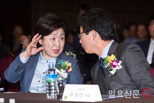 [일요신문] 유승민 바른정당 대선후보가 14일 오후 서울 여의도 63빌딩에서 열린 제19대 대통령 후보 초청 직능-시민사회단체 전국대표자 대회에 참석해 심상정 정의당 후보와 이야기를 나누고 있다. / 최준필 기자 choijp85@ilyo.co.kr