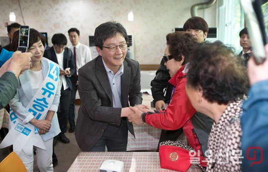 [일요신문] 유승민 바른정당 대선 후보와 부인 오선혜 씨가 26일 오전 서울 관악구 관악노인종합복지관을 찾아 어르신들에게 지지를 호소하며 악수를 하고 있다. 2017.4.26 고성준 기자