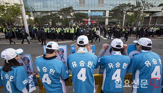 [일요신문] 다섯 번째 대선후보 TV 토론회가 열린 28일 오후 서울 마포구 상암동 MBC신사옥경영센터 앞 대선 후보자 선거운동원들이 선거운동을 하지 못 한 채 피켓을 들고 서있다. 이날 선거운동 측 관계자는 "MBC신사옥경영센터 앞 고공투쟁단 집회로 인해 선거운동을 제대로 하지 못했다."고 전했다. 2017.4.28 고성준 기자
