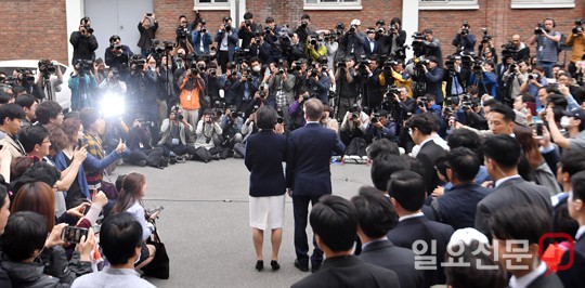 [일요신문] 더불어민주당 대선후보인 문재인 후보와 부인 김정숙 씨가 제19대 대통령선거일인 9일 서울 홍은2동 제3투표소인 홍은중학교에서 투표를 마치고 취재진의 질문에 답변하고 있다. / 최준필 기자 choijp85@ilyo.co.kr