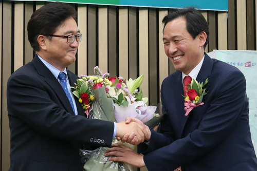 [일요신문] 16일 오전 국회에서 열린 더불어민주당 원내대표 선출선거에서 우원식 의원이 선출, 함께 출마한 홍영표 의원이 축하 인사를 하고 있다.