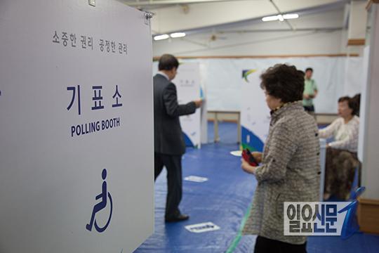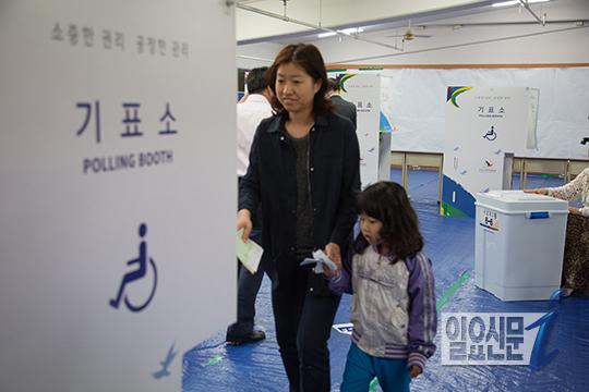 [일요신문] 4일 오전 7시 전후 동작구 사당동에 마련된 투표소에서 유권자들이 이른 시간임에도 불구하고 줄을 서서 투표를 하고 있다. 어린아이와 함께 투표하며 산교육을 실천하고 있다. 사진 이종현 기자 jhlee@ilyo.co.kr