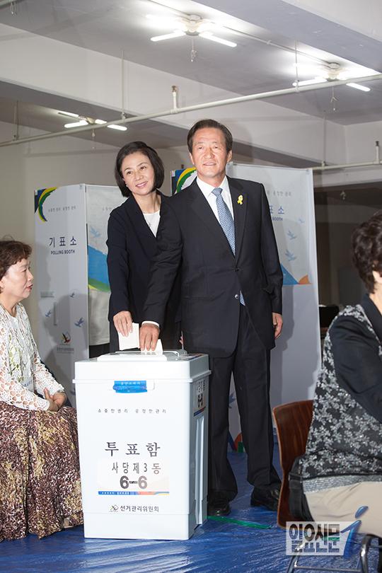 [일요신문] 4일오전 정몽준 새누리당 서울시장 후보와 부인 김영경씨가 동작구 사당동에 마련된 투표소에서 투표를 하고 있다. 사진 이종현 기자 jhlee@ilyo.co.kr