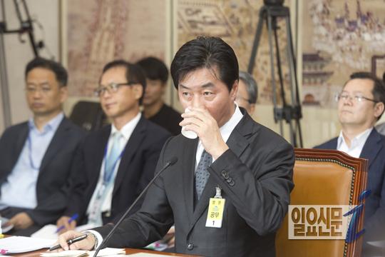 [일요신문] 10일 오전 국회에서 열린 교육문화체육관광위원회(교문위)에서 정성근 문화부장관 후보자에 대한 인사청문회가 진행되고 있는 가운데 정성근 후보자가 의원들의 질문에 답하던 중 물을 마시며 한숨 돌리고 있다. 한편, 집중적으로 음주운전 사실과 부동산 거래사실을 추궁하던 새정치연합 교문위원들은 정 후보자가 서울 강남구 일원동 우성아파트 양도세 탈루 의혹 해명 과정에서 오전과 오후 말을 번복하고 "결과적으로 거짓말을 했다"고 인정한 점을 꼬집으면서 "결국 위증의 민낯을 드러냈다. 애초부터 작정하고 국민을 속이려고 했던 것"이라고 주장했다.