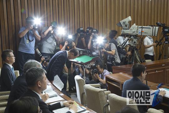 [일요신문] 10일 오후 국회에서 열린 세월호침몰사고의 진상규명을 위한 국정조사 특별위원회(세월호특위)에 참석한 김기춘 대통령비서실장이 업무, 현황보고를 마치고 인사하고 있다.