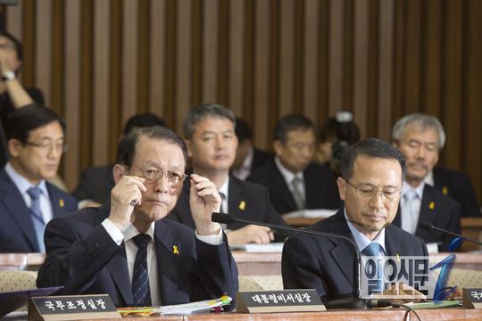 [일요신문] 10일 오후 국회에서 열린 세월호침몰사고의 진상규명을 위한 국정조사 특별위원회(세월호특위)에 참석한 김기춘 대통령비서실장이 의원들의 질문을 받던 중 안경을 고쳐쓰고 있다.