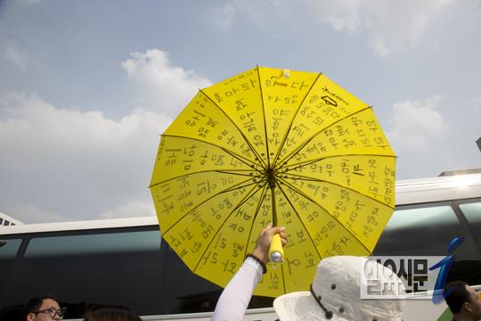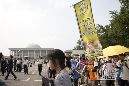 [일요신문] 새월호사고에서 생존한 단원고 학생들이 안양에서부터 서울까지 1박2일 동안 걸어서 올라와 16일 오후 국회정문앞에 도착했다. 학생들은 세월호 사고진실규명을 위한 세월호특별법의 조속한 제정을 촉구하는 깃발을 국회 울타리에 매달아 놓고 버스로 돌아갔다. 노란우산속에 아이들 이름을 써 놓은 학부모가 우산을 들고 아이들을 보내고 있다.