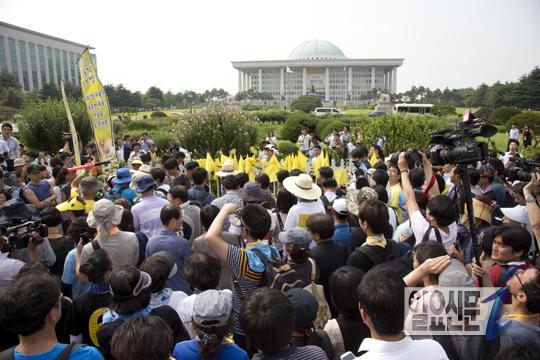 국회 울타리에 노란깃발을 달고 있는 단원고 학생들...