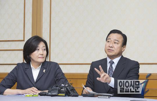 좋아하는 박영선 원내대표, 지켜보는 이완구 원내대표
