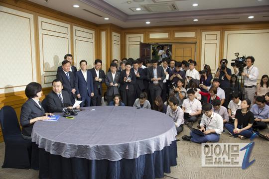 [일요신문] 19일 오후 여야원내대표가 세월호 특별법에 합의했다. 이완구 새누리당 원내대표와 박영선 새정치민주연합의 원내대표는 지난 7일에 이루었던 합의가 새정치 민주연합의 거부로 험난한 재협상의 과정을 거쳐 7월 임시국회의 마지막날 극적으로 타결 되었다. 여야 원내대표가 자리를 떠나고 있다.