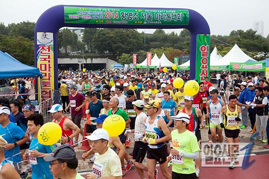 [일요신문] <여성경제신문>창간기념 '2014 황영조 서울 마라톤 대회'가 열린 28일 오전 서울 한강공원 잠실지구에서 참가자들이 힘찬 출발을 하고 있다.