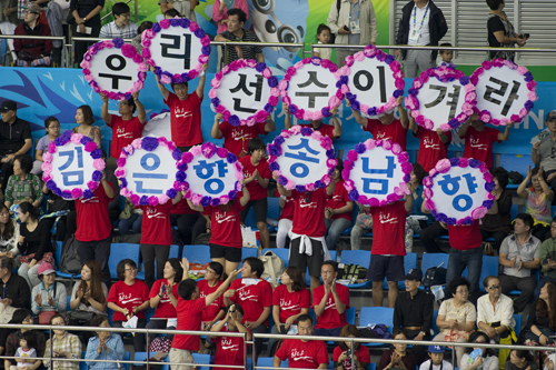 [일요신문] 30일 오후 인천 문학박태환수영장에서 열린 2014 인천아시안게임 다이빙 여자 싱크로나이즈 10m 플랫폼 결승전에서 관람객들이 북한의 김은향, 송남향 선수를 응원하고 있다.