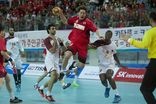 [일요신문] 정수영 선수가 2일 인천 선학핸드볼경기장에서 열린 2014 인천 아시안게임 핸드볼 남자결승에서 공격을 시도하다 카타르의 수비진에 막혀 있다.