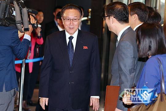 [일요신문] 인천 아시아경기대회 폐막식에 참석하기 위해 입국한 북측 대표단 김양건 노동당 비서가 4일 오전 인천 송도 오크우드 호텔에서 우리측 대표단과 인사를 나누고 있다.